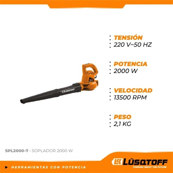 Marca LüsqtoffModelo SPL2000-7Potencia 2000 WattsVelocidad 13.500 RPMTipo de Alimentación Eléctrica (Cable)Tensión 220V - 50HzPeso Ligero y maniobrableUso Doméstico / Jardinería