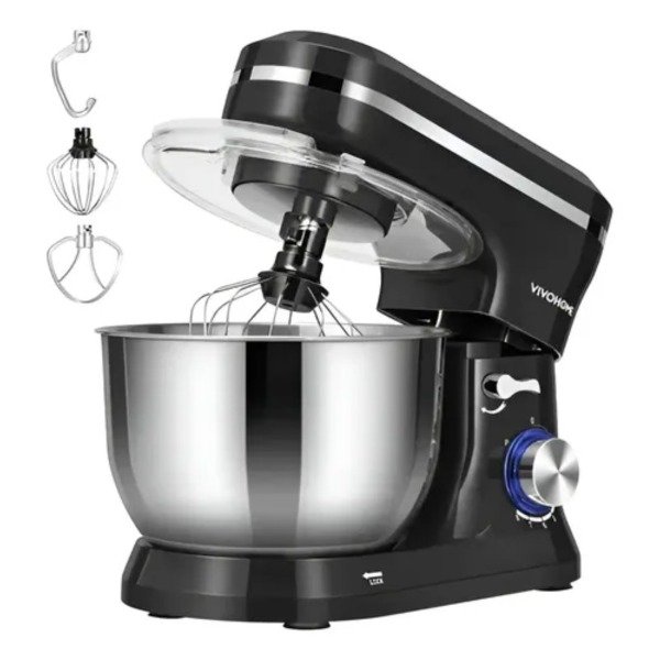 - Accesorios Profesionales Incluidos: Viene equipada con batidor de alambre (cremas), gancho amasador (panes/pizzas) y paleta mezcladora (masas de tortas), todos de fácil intercambio.